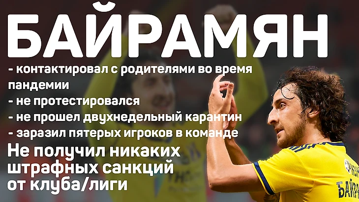 "Нулевым" больным в "Ростове" стал Хорен Байрамян. Игрок, вероятно, заразился от родителей, когда навещал их. Это вообще нонсенс: как руководство "Ростова" сначала позволило Байрамяну в такой ситуации покидать расположение клуба, после этого его не протестировали и не посадили на двухнедельный карантин? О каком вхождении в положение может идти речь, если здесь на лицо халатность со стороны руководства дончан? О каком вхождении в положение речь, если игрок, зная о пандемии, ведет себя столь безответственно?