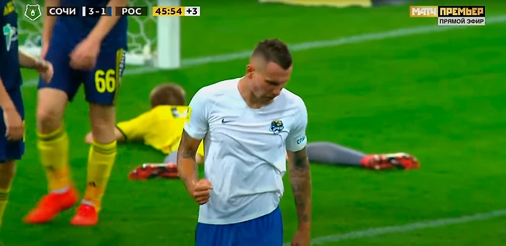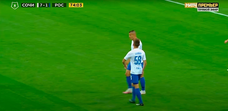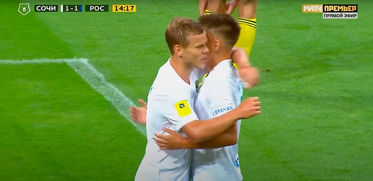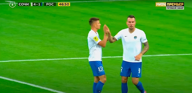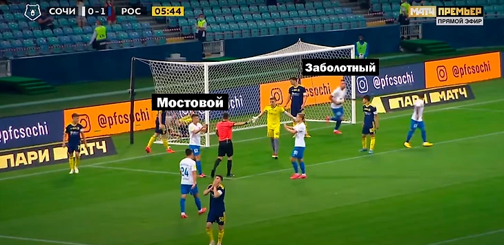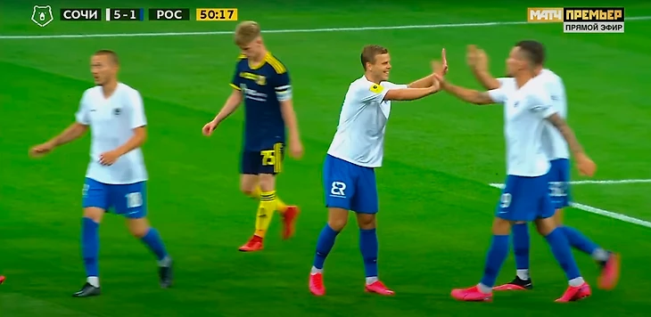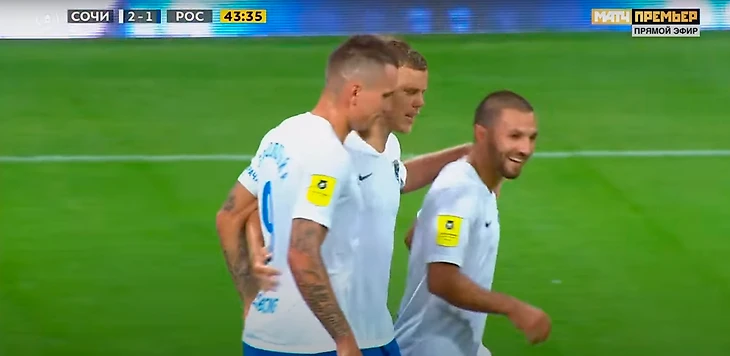 После гола Мостовой остановился, а после неспешно пошел к центру, и показал кому-то сердечко. Заболотный схватил мяч и побежал к центру (логично, что сочинцам хотелось побыстрее выйти вперед против такого соперника) и отбил кому-то пятушку. Типичное празднование уровня товарняка на сборах.