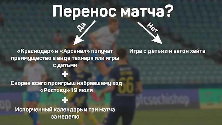 Перенос был невыгодным решением для "Сочи" по всем параметрам: это было бы несправедливо (описано выше), команда получила бы три матча за неделю и скорее всего проиграла бы "Ростову" 19 июля. Будем реалистами, "Сочи" нашел лучший выход из заведомо патовой ситуации.