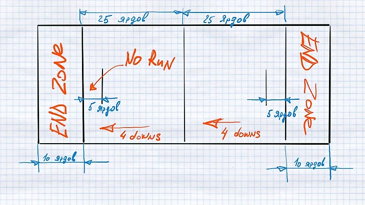 Итак, с каждой стороны поля располагаются 10-ярдовые зачетные зоны (End Zone). От зачетной зоны до середины поля расположена 25-ярдовая половина. Если применить великую математику, то мы получим игровое поле в 50 ярдов. Обычно, весь движ происходит на нем. На каждой половине есть важная отметка в пять ярдов. С нее на своей половине начинает розыгрыш атакующая команда. А когда нападение доходит до этой отметки на чужой половине, ему запрещается использовать выносные комбинации. На своей половине выносить можно сразу.