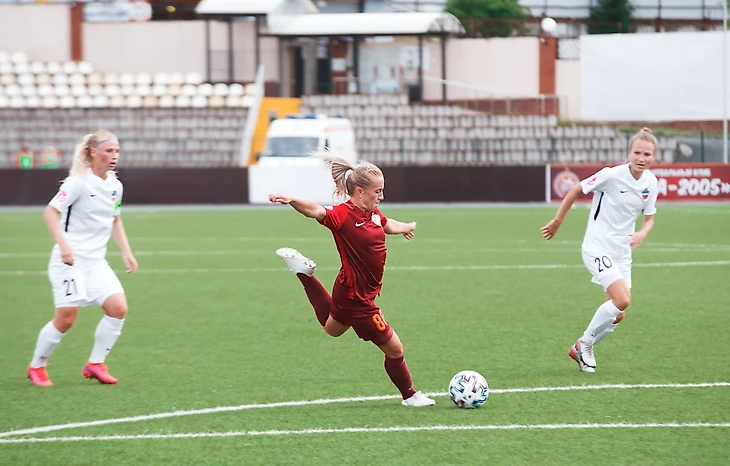 Проявлять себя новички «Локомотива» начали буквально с самого старта. Уже на третьей минуте Козыренко элегантно подстроилась под передачу Мягковой с правого фланга и забила едва ли не самый красивый гол тура.