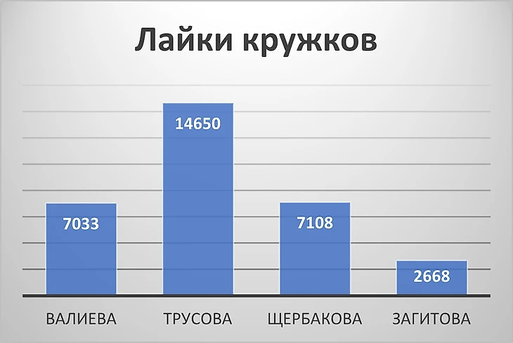 И вот здесь мы видим первую странную вещь, по какой-то непонятной причине фанаты Загитовой отказываются лайкать ее кружочки. Фанаты же Трусовой наоборот, лайкают их с неимоверной активностью. У Валиевой и Щербаковой здесь примерно поровну, в два раза меньше чем у Трусовой, и в два раза больше чем у Загитовой.