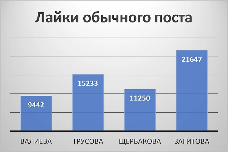 В среднем каждый пост Валиевой и Щербаковой получает примерно 10к лайков, у Трусовой около 15к, а вот Алиночка Загитова однозначно опережает даже русскую ракету, ведь ее посты получают в среднем более 20к лайков! Поразительно.