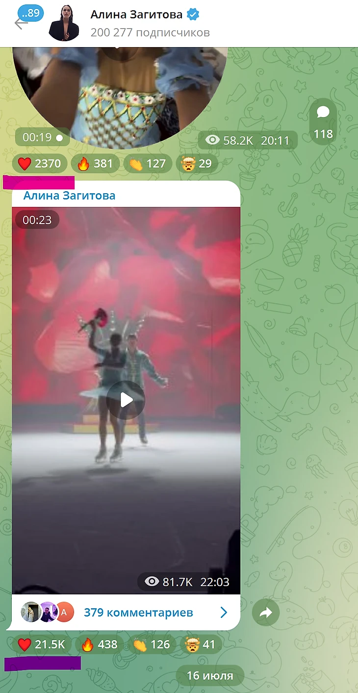 Еще одним полем для соревнований и виртуальных побед являются соцсети. И в самой популярной из них, в Telegram, Алиночка сделала большую заявку на серьезную победу. Давайте посмотрим на странички Загитовой, Трусовой, Валиевой, и Щербаковой, и попробуем немного посчитать лайки и комментарии, чтобы оценить популярность звезд и активность их фанатов.