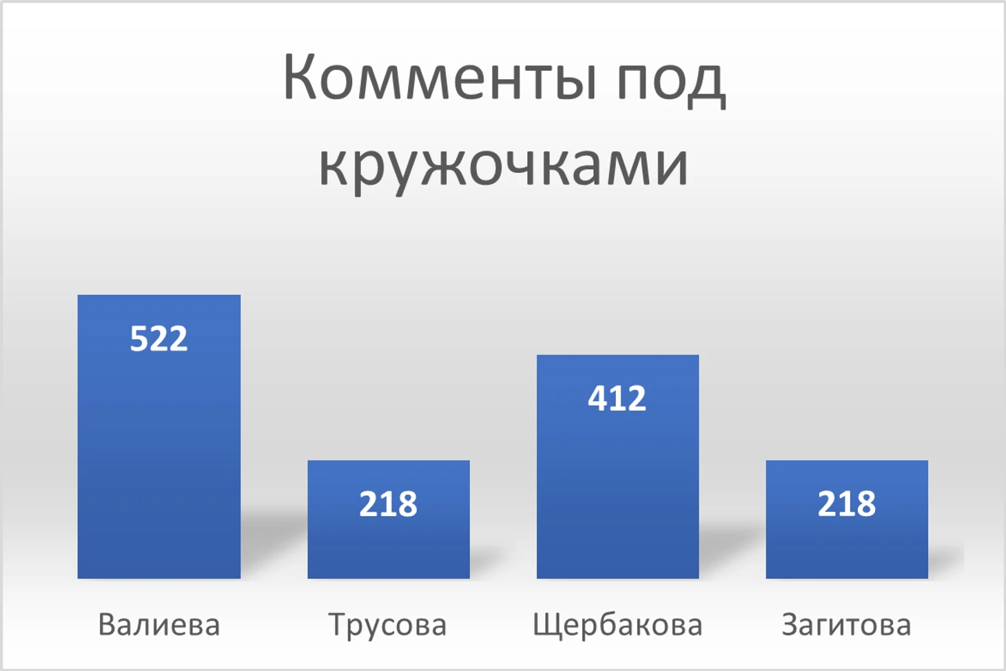 В комментариях кружочков снова побеждает Валиева со своими активными фанатами, а второе место как и в обычных постах достается Щербаковой, фанаты которой хотя и уступили фанатам Валиевой, но тем не менее по активности практически в два раза обогнали фанатов Трусовой и Загитовой.