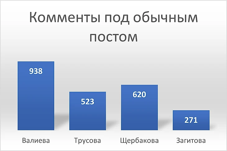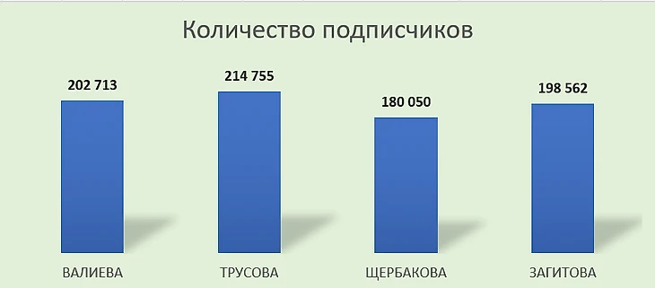 Здесь лидирует Трусова, меньше всех у Щербаковой, но в целом у них примерно одинаковое количество подписчиков, около 200к у каждой.