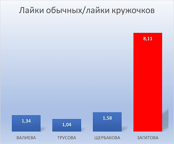 И вот здесь отчетливо проявляется странная аномалия у Загитовой. Если у других девочек соотношение лайков обычных и кружочков примерно одинаковы, и близки к единице, то у Алиночки Загитовой видно что ее кружочки лайкаются на порядок меньше, чем обычное посты.