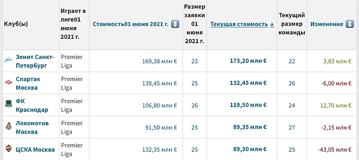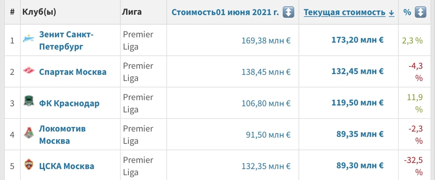 Для наглядности приведем список тех, кто своей потенциальной монетизацией помогает ЦСКА оставаться в Топ-5 по стоимости составов: