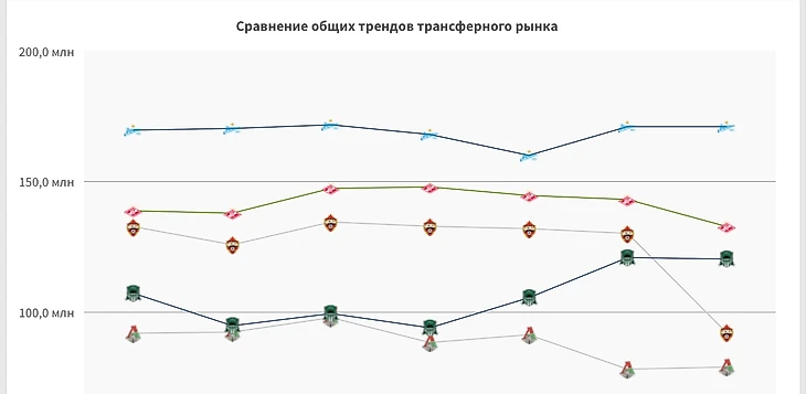 До закрытия трансферного окна в России остаётся чуть более 3 дней. И к настоящему моменту можно констатировать, что по итогам летних трансферов, по данным Transfermarkt, ЦСКА покинул тройку лидеров и замкнул Топ-5 по совокупной стоимости игроков основного состава (89,3 млн. евро). По этому показателю «армейцы» идут ноздря в ноздрю с «Локомотивом» (89,35 млн. евро), отставая всего на 50 тыс. евро.