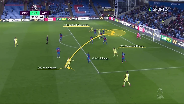 Эдегор с мячом на углу штрафной площадки. Эль-Ненни врывается в штрафную в лучших традициях Рэмзи, но маневр замечен Шлуппом. На дальней штанге у Мартинелли готов ответ.