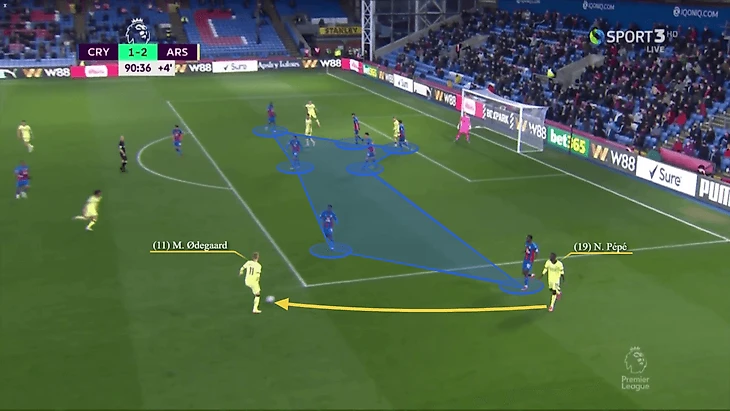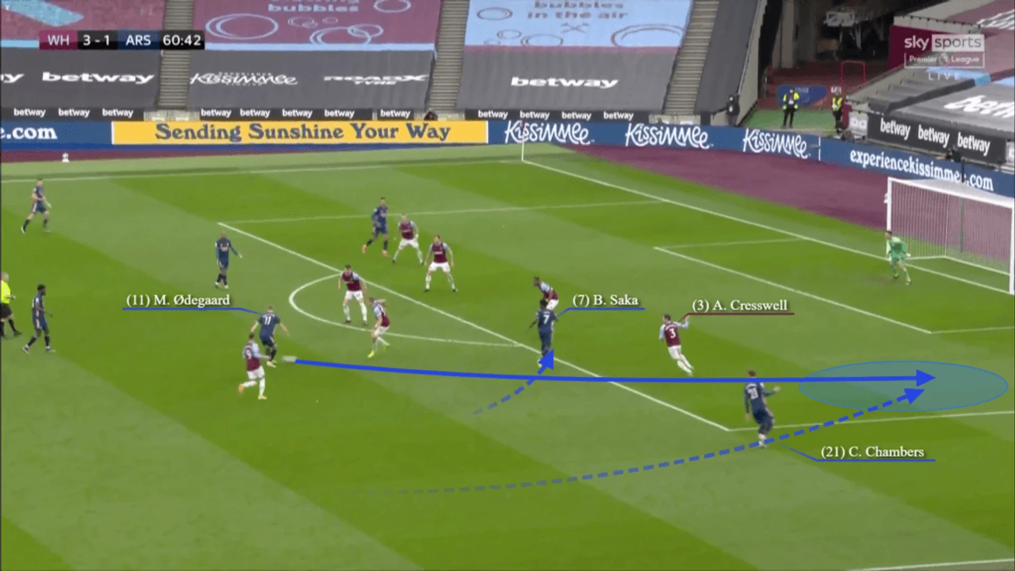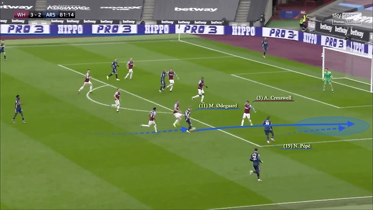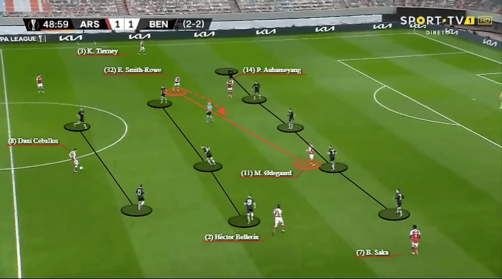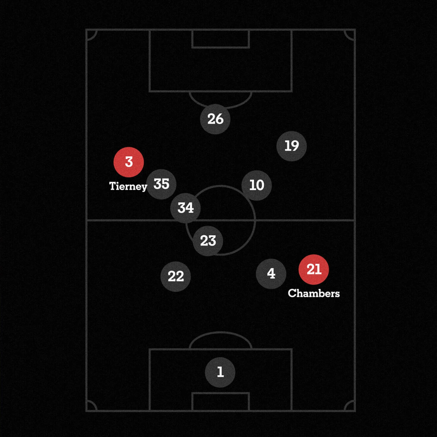 Тирни, как обычно, расположен высоко и широко. Смит Роу грамотно открывается между линиями. Сака поддерживает высоту и ширину атаки, а Эдегор на одной линии с Обамеянгом.