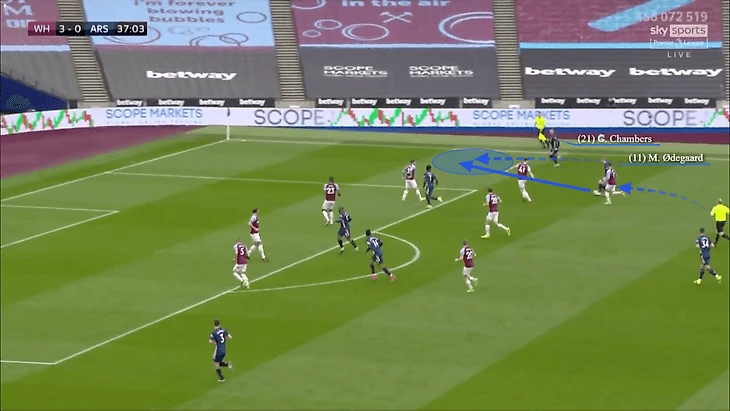 Эдегор видит, что Смит Роу вот-вот получит мяч и заранее открывается.