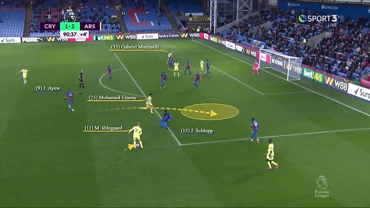 Справедливо отмечается, что этот прием был использован еще в первом матче Микеля Артеты у руля лондонской команды. Тогда данную позицию вынуждено занимал Сака, а пространство между высоко расположившимся англичанином и левым центральным защитником занимал Джака.