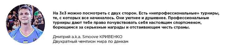 В 3х3 нет ограничения на профессиональных игроков из классического баскетбола. Даже больше, многие игроки 3х3 проводят зимний сезон в командах 5х5, однако, стоит признать, что это не топовые команды, а чаще всего клубы вторых-третьих дивизионов. Последнее время наметилась некоторая тенденция, при которой профессиональные игроки 5х5 стали более активно уходить в 3х3 не ради развлечения и поддержания формы. Кто-то перезапускает карьеру, кто-то находит себя именно в этом формате, плюс активное развитие 3х3 в целом делает свое дело.
