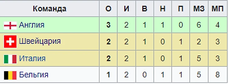 Матч открытия заключительной группы мундиаля подарил зрителям сенсацию (хозяева швейцарцы одолели 2-кратных чемпионов мира итальянцев) и в то же время закончился скандалом, суть которого обсудим в одноимённом разделе. Победителем 4-ой группы стали родоначальники футбола, а Швейцария и Италия бились за плей-офф в переигровке. На сей раз обошлось без скандалов. Уверенную победу со счётом 4:1 одержали «красные крестоносцы».