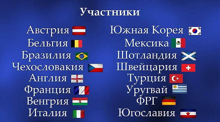 В общем, отборочные матчи явили свету следующих участников Чемпионата Мира: Австрия, Бельгия, Бразилия, Чехословакия, Англия, Франция, Венгрия, Италия, Южная Корея, Мексика, Шотландия, Швейцария, Турция, Уругвай, Западная Германия, Югославия. Не обошлось и без несправедливостей.