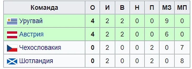 В 3-ей группе без особых проблем в плей-офф пробился Уругвай с Австрией. А замкнула квартет под №3 привезшая лишь 13 игроков Шотландия, которая после бана от своей же федерации 4-мя годами ранее, всё же дебютировала на главном турнире сборных.