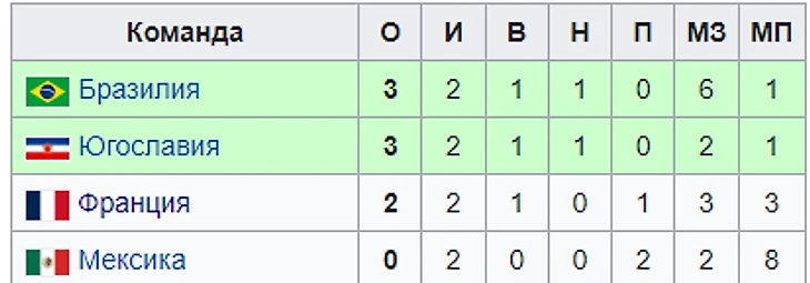 Чемпионат Мира в Швейцарии стартовал с 2-х параллельных матчей: Бразилия-Мексика и Югославия-Франция (что интересно трое из этих 4-х команд выступали в одной группе и на бразильском мундиале 1950 года). По результатам 1-ого тура квартет возглавила Бразилия, разгромившая Мексику 5:0, и Югославия, минимально переигравшая страну-хозяйку предыдущего первенства. 2-ой круг получился, наверное, самым неинтересным за всю историю чемпионатов мира. Бразильцы и югославы спокойненько сыграли вничью и не оставили никаких шансов сборной Франции на выход в плей-офф.