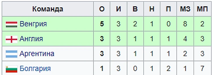4-ый состав участников впервые заставил организаторов обратиться к разнице забитых и пропущенных мячей. Показавшие лучшие цифры англичане опередили в таблице аргентинцев и вместе с Венгрией шагнули дальше.