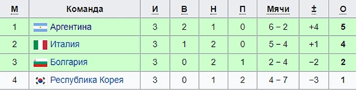 Группа А свела между собой 2-х последних чемпионов мира (Аргентину и Италию), а также сборные Южной Кореи и Болгарии. Сенсаций не произошло, и фавориты шагнули дальше. Единственный занимательный факт заключается в том, что все голы «скуадры адзурры» забил один единственный парень по имени Аллесандро Альтобелли.