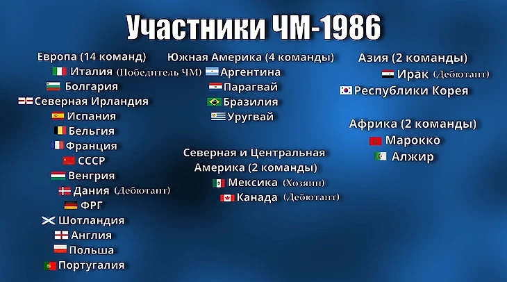 1986 год включит в себя 13-ый Чемпионат Мира по футболу. Цифра 13, всеми известная как «чёртова дюжина», сыграет, как окажется, немалую роль в решающих матчах, чего стоит только знаменитый гол Марадоны рукой. Но этот эпизод и так все знают. А что же знаменательного произошло на кубке мира 1986 ещё? Данная статья окунёт Вас в САМЫЙ СОЛЬНЫЙ Чемпионат Мира по футболу 1986 года. Поехали