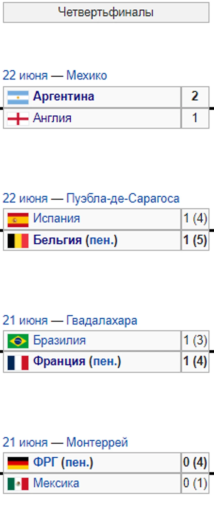 Поединки ¼ финала получились просто сверх напряжёнными. Целых 3 встречи из 4-ёх завершились послематчевыми 11-метровыми. Сборная ФРГ со счётом 4:1 перебила хозяев мексиканцев, Бельгия в свою очередь – испанцев, а вот матч Франции и Бразилии был примечателен не только серией пенальти. Сам Пеле называл ту игру лучшей в истории Чемпионатов Мира. Чем она запомнилась, спросите Вы?