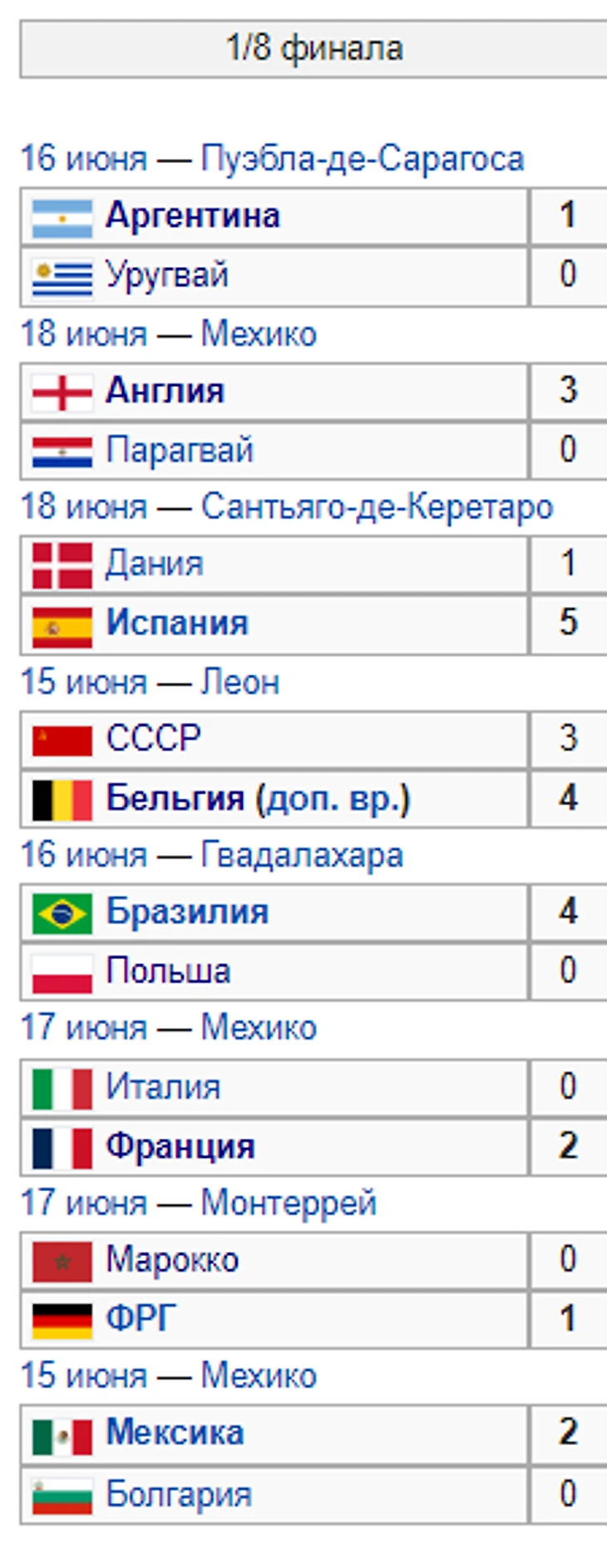 Теперь же самое вкусное. Раунд на вылет. Исходя из результатов 1/8 финала, внимание хочу заострить лишь на раннем вылете действующих чемпионов мира итальянцев, на разгроме датчан испанцами со 2-ым покером в истории кубком мира от Эмилио Бутрагеньо, а также на перестрелке Бельгии и СССР, из которой наши парни, к сожалению, вышли проигравшими.