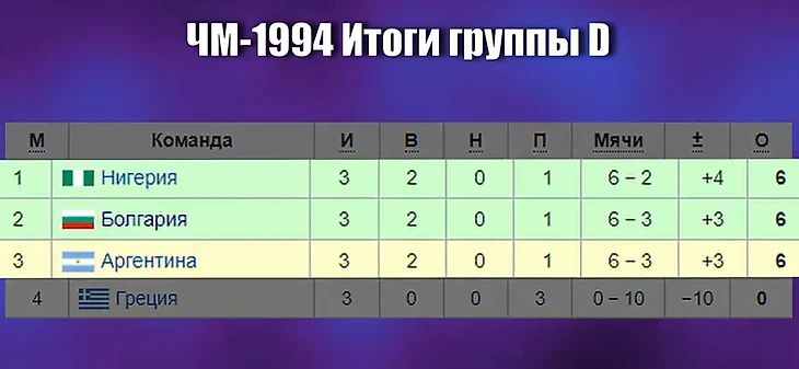 Трое из 4-ёх участников группы с индексом D (Нигерия, Болгария и Аргентина) набрали по 6 очков и уверенно шагнули дальше, однако в стане сборной Аргентины радости было немного, ведь матч 2-ого тура с Нигерией стал последним на Чемпионатах Мира для лучшего игрока того времени Диего Марадоны.