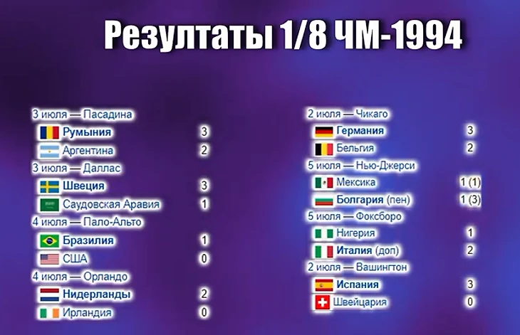 Как видите, несмотря на огромное число трагических событий, среди которых убийство Эскобара, закат карьеры Марадоны и промах Баджо, Чемпионат Мира в Соединённых Штатах получился всё-таки классным, особенно что касается стадии плей-офф. Такое количество драматических событий, включивших в себя и громкие победы аутсайдеров над последними чемпионами мира, и невероятные развязки в серии пенальти, встречаются очень и очень редко. Также стоит отдать должное организаторам, которые доверили мундиаль американцам. В итоге мы получили САМЫЙ ПОСЕЩАЕМЫЙ ЧЕМПИОНАТ МИРА В ИСТОРИИ футбола, то ли ещё будет! До встречи через неделю.