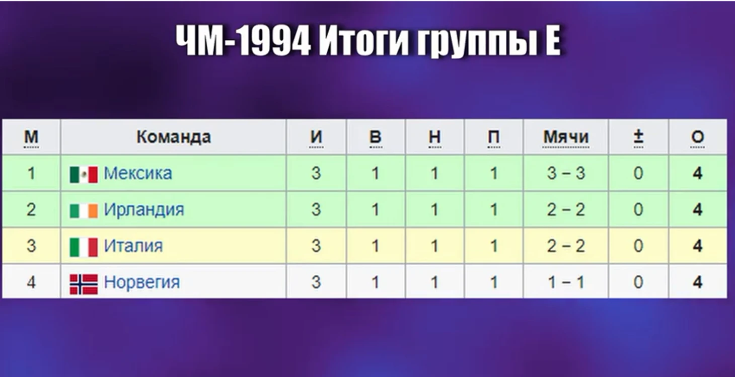 Группа E выдалась самой уникальной за всю историю проведения Чемпионатов Мира. Мало того, что все 4 команды набрали одно и тоже количество очков, так и ещё имели в своём активе одинаковую разницу забитых и пропущенных. Организаторам пришлось расставлять команды, смотря на забитые голы. Таким образом 1-ое место заняла Мексика, а за бортом мундиаля осталась Норвегия.