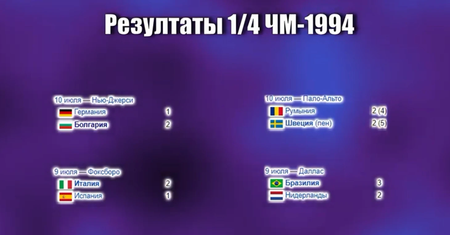 После бури эмоций в четвертьфинальных встречах вполне логично, что полуфиналы получились куда менее яркими и событийными. Бразилия скромненько 1:0 выиграла у Швеции, а главному открытию турнира сборной Болгарии банально не хватило сил на 2-ую подряд громкую сенсацию. Без особого сопротивления болгары проиграют ещё и матч за 3-е место.