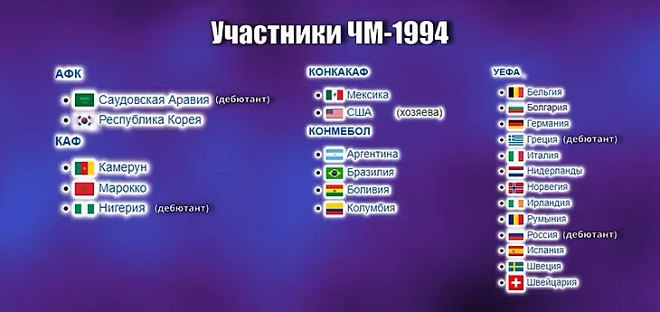 Итоговый список участников мундиаля 94-ого выглядел следующим образом: Бельгия, Болгария, Германия, Греция, Италия, Нидерланды, Норвегия, Ирландия, Румыния, Испания, Россия, Швеция, Швейцария, Мексика, США, Аргентина, Бразилия, Боливия, Колумбия, Саудовская Аравия, Республика Корея, Камерун, Марокко, Нигерия. Впервые в финальный турнир пробилась Греция, Нигерия и Саудовская Аравия. Также к дебютантам ввиду распада Советского Союза можно отнести и команду России. Больше всего удивляет не приезд французов, которые умудрились проиграть 2 последние игры отбора (прости, Господи) Израилю и Болгарию, а также не приезд ни одной британской сборной – такое случилось впервые с 1938 года.