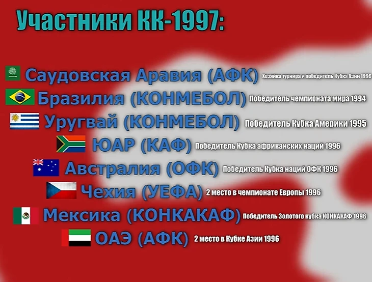 Кубок Конфедераций – это турнир действующих победителей континентальных трофеев (6 команд) + к ним добавляется действующий чемпион мира и страна-хозяйка. В 1997 году в Саудовскую Аравию приехала Бразилия в статусе чемпиона мира, Уругвай - в статусе победителя Кубка Америки, а также Австралия – победитель ОФК, ЮАР – победитель Кубка Африки, Мексика – победитель Кубка КОНКАКАФ, Саудовская Аравия, Объединённые Эмираты и Чехия. Участие ОАЭ было обусловлено тем, что саудовцы были одновременно и хозяевами, и обладателями Кубка Азии, а коллектив из Чехии получил право выступить, так как сборная Германии (чемпионка Европы 1996 года) отказалась ехать в Аравию.