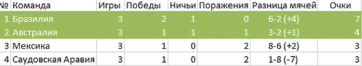 По итогу бразильцы с 7-ю очками вышли из группы с Австралией, Мексикой и Саудовской Аравией с 1-ого места. «Они были очень сильны. По моему мнению это идеальная команда, команда-мечты», - скажет впоследствии о сборной Бразилии саудовский игрок Сами Аль Джабер.Если перфоманс Бразилии выглядел вполне ожидаемым, то вот выход со 2-ого места Австралии, а не Мексики, можно назвать сенсацией.