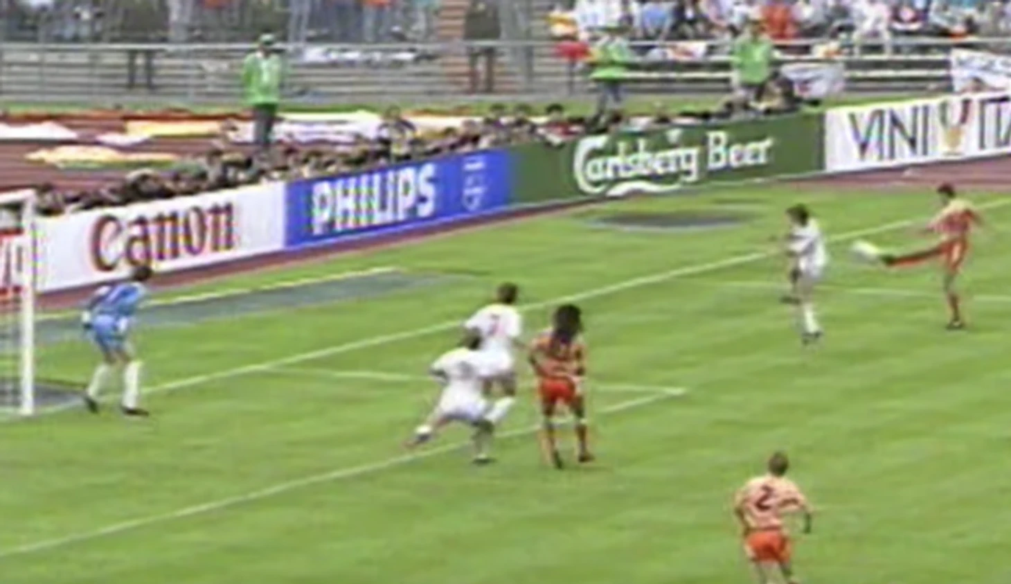 Второй тайм получился для наших на порядок хуже. Как бы не старался Алейников противостоять «утрехтскому лебедю», класс есть класс. Девятая минута второго тайма станет одной из самых запоминающихся в истории футбола. Ван Тигелен протащит мяч по центру и отдаст на подключившегося слева «дедушку» (38 лет) Мюрена. Тот сделает пару шагов и примерно из района левого угла штрафной вырежет длинный и очень высокий навес на противоположную часть пенальтерии, куда уже летел на всех порах неудержимый лебедь. Вероятно, всем показалось, что сейчас последует остановка мяча, его укрощение, разворот лицом к воротам ну и далее все, что положено в таких случаях. Но Марко поступил нестандартно. Находясь к воротам боком и под довольно острым углом, он с лету нанес потрясающий удар с подкруткой, мяч по крутой дуге сверху вниз обогнул подпрыгнувшего Дасаева, нырнул под перекладину и взметнул сетку у дальней штанги.