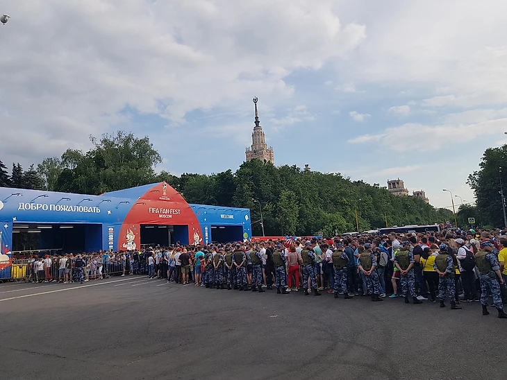В один момент майор дает отмашку молодым парням в форме, и они сжимаются в кольцо. По громкоговорителю объявляют о закрытии фан-зоны, в связи с ее переполнением. Большая часть достает свои смартфоны, и с замедлением в несколько секунд по толпе проносятся один за другим клич о голе мексиканцев. Некоторые расходятся вглубь парка, рассасываясь по барам, особо стойкие продолжают ждать у входа, в надежде что запуск внутрь продолжится. И это не напрасно - в конце первого тайма, нам удается пройти!