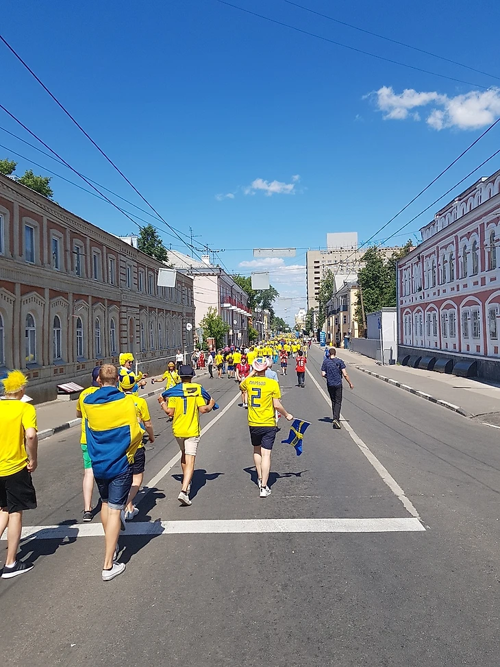 В центре уже полно людей, идущих на стадион. Из окон своих старых домов высовываются домохозяйки в бюстгальтерах, смотрящих на желтое море из шведов. Настроение снова выходит на свой пик, и мы предвкушаем свой первый матч чемпионата мира.