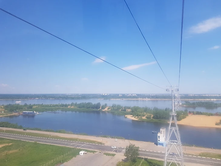 Подойдя к кассам канатной дороги, неожиданно встречаем трех хорватов, облаченных в футболки национальной сборной. Милая девушка кассир продает нам билеты на ту сторону Волги за 100 рублей, и мы садимся в маленький вагончик.