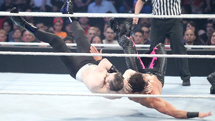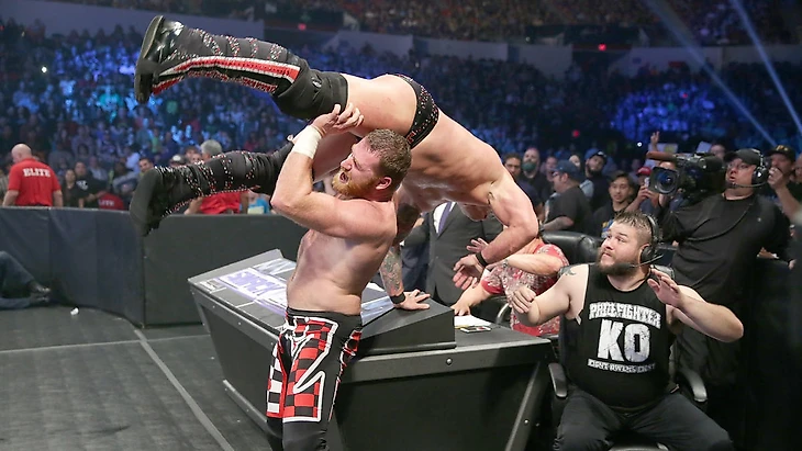 Ещё один изумительный бой в копилку SmackDown занесли Крис Джерико и Сэми Зейн при непосредственном участии Дина Эмброуза и Кевина Оуэнса. От концентрации крутых рестлеров и ещё более крутых микрофонных троллей, воздух на арене был наэлектризован до предела. Ну да обо всём по порядку. После того как бойцы поднялись на ринг, на комментаторскую панель решил сесть Кевин Оуэнс. Но он даже дойти не успел до неё, как за ним проследовал Дин Эмброуз с пачкой распечатанных агиток со своим изображением. Он их щедро разадавал всем желающим, а затем уселся рядом с Мауро чесать языком на микрофоне. Затрудняюсь ответить, что меня больше впечатлило - сочные комментарии или происходящее на ринге, но в совокупности получился отличный мейн-эвент вечера, который в середине подогрелся использованием Дина и Кевина в качестве мишени для избиения. Когда всё действо переместилось обратно на ринг, Сэми после "суплекса" в тёрнбакл уже вышел на "хелува кик", когда на него напал Оуэнс. Вместе с Джерико они принялись выбивать весь канадский дух из Зейна, пока всю эту вакханалию не разогнал Эмброуз, который отбил "кепкастого", и они остались праздновать успех вместе со зрителями.