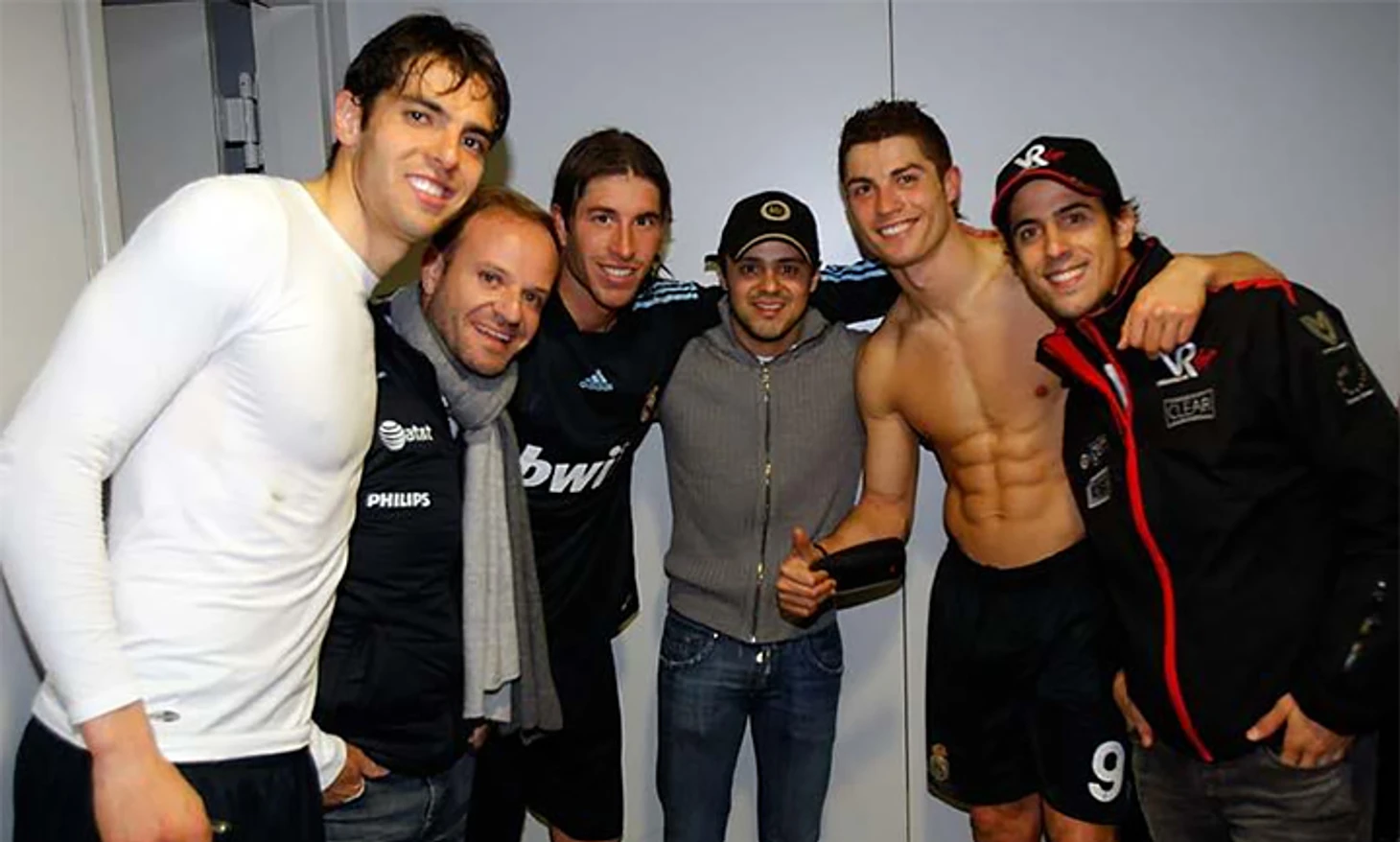 Целая делегация бразильских гонщиков посетила матч «Реала» с «Хересом» в первый сезон Роналду в Мадриде. Не обошлось без визита в раздевалку и фоток с Кака, Серхио Рамосом, и конечно же, Криштиану.