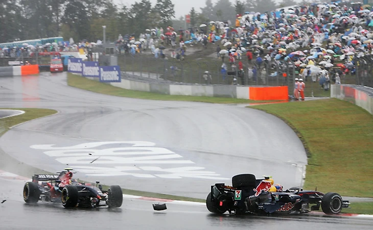 Льюис Хэмилтон, проводивший первый сезон в «Ф-1», вел пелотон за машиной безопасности по дождевой «Фудзи». В определенный момент англичанин замедлился, чтобы прогреть тормоза и отпустить серебристый «Мерседес» перед рестартом. Опытный Марк Уэббер успел среагировать на маневр Хэмилтона, выбрал другую траекторию и затормозил, а вот шедший третьим пилот «Торо Россо» Себастьян Феттель (тоже новичок) не ожидал такой внезапности и врезался в австралийца.