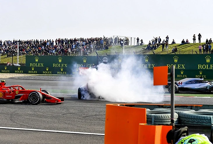 Веселье продолжилось и в Китае: Ферстаппен пошел в атаку на все того же Хэмилтона по внешней траектории седьмого поворота и закономерно вылетел с трассы, подарив позицию напарнику, а затем торпедировал Феттеля в предпоследнем повороте.