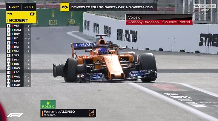 Эпизод получил продолжение на следующей прямой: из-за упавшей скорости Сироткин оказался в сэндвиче между обгонявшими его Хюлькенбергом и Алонсо. Но трем машинам места не хватило, произошел контакт – и подвеска «Уильямса» пришла в негодность. Испанский гонщик «Макларена» получил прокол и отправился в боксы буквально на двух колесах, волочась днищем по асфальту.
