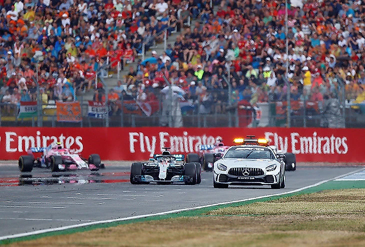 После аварии «Феррари» на трассу выехал автомобиль безопасности — и выигравшим в стратегическую лотерею неожиданно оказался вчерашний неудачник Хэмилтон. Он 42 круга с начала гонки ехал на более жестком «софте», а затем перед дождевым периодом получил мягкий «ультрасофт». Сцепления «фиолетовых ободков» оказалось достаточно для влажного асфальта: пока соперники вылетали, разбивались, многократно меняли слики на промежуточные шины и обратно (Пьер Гасли даже рискнул с дождевой – и не угадал), англичанин почти без проблем дотянул до сэйфти-кара. Лишь раз у Хэмилтона случился сложный момент с недостатком сцепления в очень мокром шестом повороте, но, в отличие от ситуации с Феттелем, пространства для исправления ошибки и сохранения позиции у него оказалось с избытком.