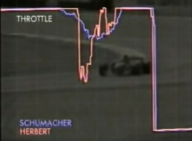 В ВВС сравнили телеметрию Шумахера с информацией с болида Херберта и увидели: Джонни намного смелее и позже уменьшает нажатие на педаль газа, но делает это в несколько раз сильнее – в итоге Михаэль в середине поворота выигрывает у напарника в районе 8 км/ч. И англичанину вообще не помогают агрессивные подгазовывания а-ля Сенна – более того, они только сильнее повреждают задние шины. Техника чемпиона выглядит плавнее и стабильнее – и только в одном этом повороте немец выиграл 0,2 секунды (всего за те круги из квалификации – 1,7 секунды).