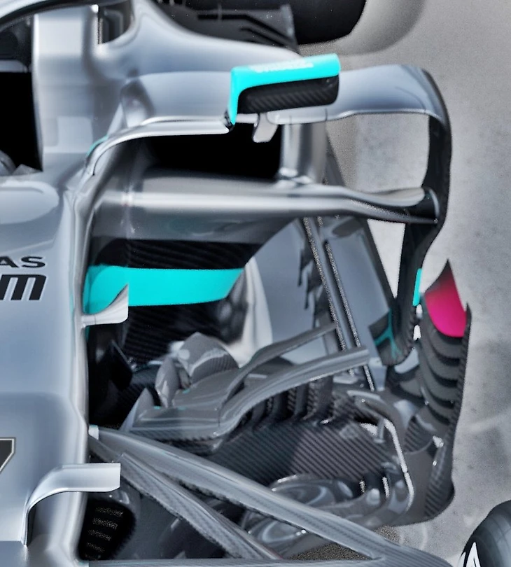 Идея настолько понравилась всем благодаря возможности перенаправлять воздух под заборником и тем самым генерировать дополнительную прижимную силу в задней части, что к старту 2019-го концепцию скопировали все команды. Кроме «Мерседеса».