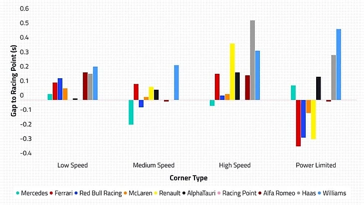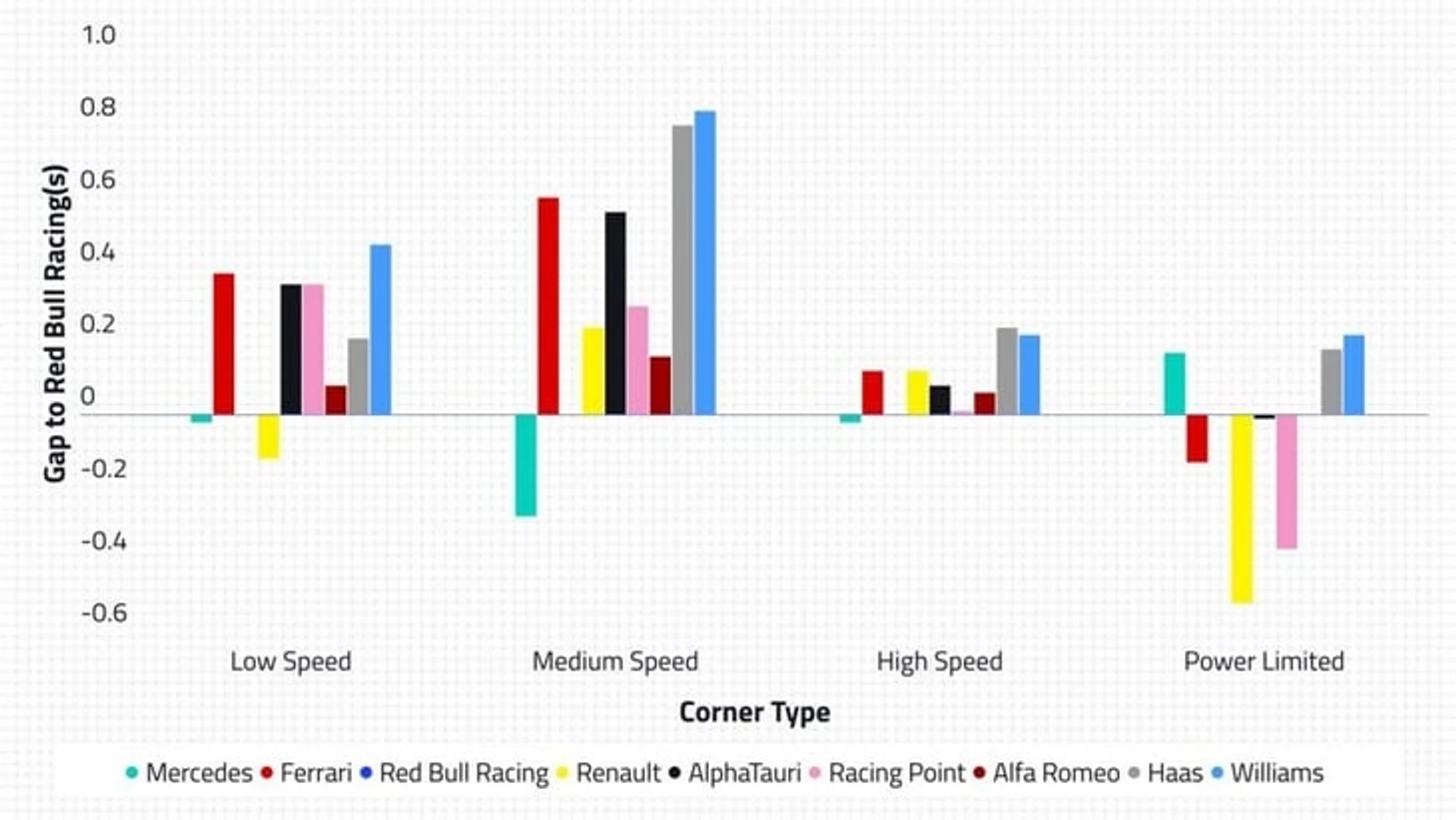 Даже из поверхностного исследования динамики позиций и отрывов Риккардо от лидеров уже видна совершенно однозначная тенденция: чем больше на трассе прямых и других участков, которые проезжают с полным газом – тем болид R.S.20 быстрее. Именно поэтому желтая машина выстрелила и в квалификациях, и в гонках на «Сильверстоуне» и «Спа-Франкоршаме», но не очень здорово выглядела на венгерском «картодроме» и чрезвычайно требовательной к аэродинамическому обвесу трассе в Испании.
