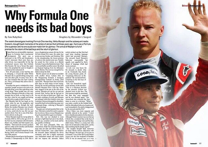 Вы можете помнить его по… тексту о Никите Мазепине. В самом начале карьеры в «Ф-1» русский пилот угодил в неприятнейший скандал с непристойным видео с инстаграме (в сториз появилась запись, как он хватает девушку за грудь). Его сразу же потребовали наказать и изгнать из Гран-при, и тогда в BusinessF1 вышла огромная 10-страничная хвалебная статья о Никите, сравнении с Джеймсом Хантом и объяснением, почему «плохие парни» нужны «Ф-1». Переводы материала выходили в «Комсомольской правде» и «Спорт-Экспрессе», а также рекламировались через Двач.