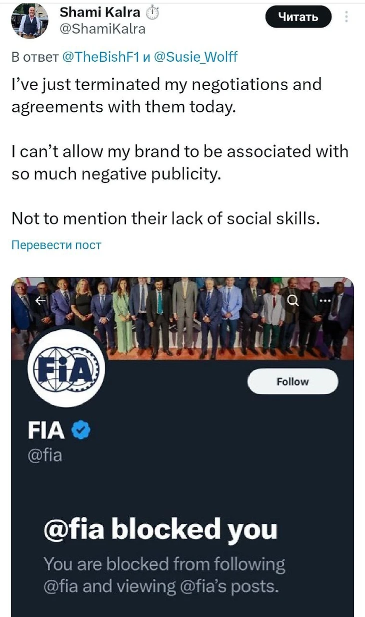 Сразу после скандала с Вольффами и рассказами про сотрясение мозга это выглядело настоящим пиар-кошмаром. Но стало еще хуже – когда основатель часового бренда премиум-класса Omologato Шами Калру рассказал в твиттере, что ФИА забанила его в соцсетях за предложение заняться улучшением условий для людей с ограниченными возможностями на автодромах вместо расследований действий Вольффов.
