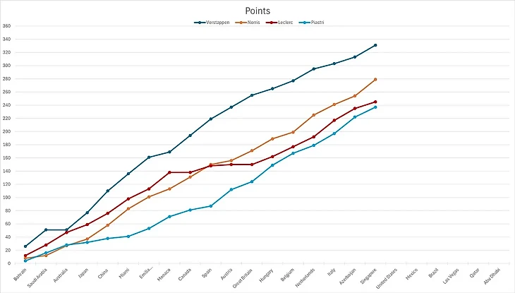 Еще мощнее выглядит драматургия года: сперва «Ред Булл» и Макс доминировали, затем к середине сезона победы одержали 7 пилотов из 4 команд, а к финальной фазе «Макларен» разогнался так, что везет действующим чемпионам по 30 секунд. Потому Норрис и вернулся в чемпионскую гонку после неудачного начала!